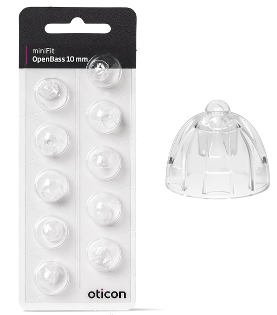 Perfectly fit with Oticon hearing aid: open minifit dome 10mm One pack is 10 domes Suggest: Hearing aid domes should be replaced once a month, because the cerumen wax buildup behind the domes
