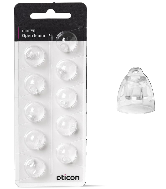 Perfectly fit with Oticon hearing aid: open minifit dome 6mm One pack is 10 domes Suggest: Hearing aid domes should be replaced once a month, because the cerumen wax buildup behind the domes