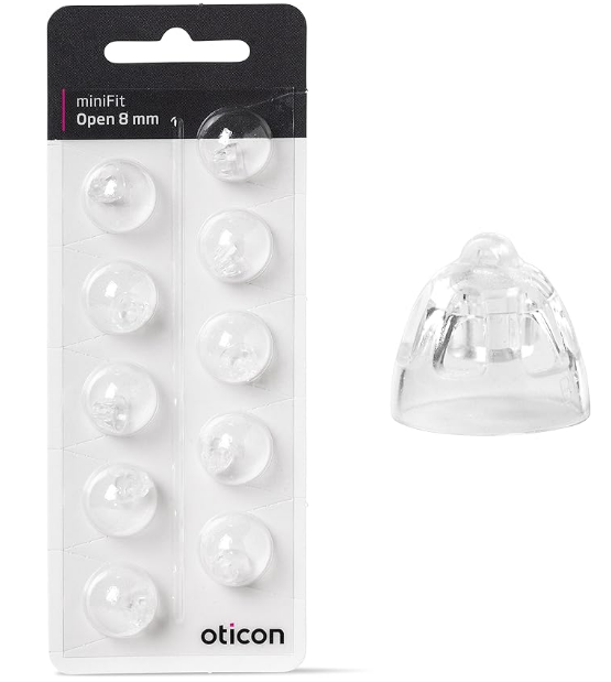 Perfectly fit with Oticon hearing aid: open minifit dome 8mm One pack is 10 domes Suggest: Hearing aid domes should be replaced once a month, because the cerumen wax buildup behind the domes