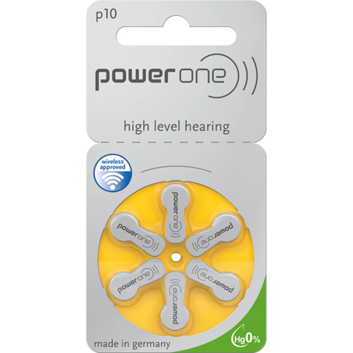 Widex branded Power One High Quality Zinc Air Battery size 10 with the yellow tab Pack of 6 batteries